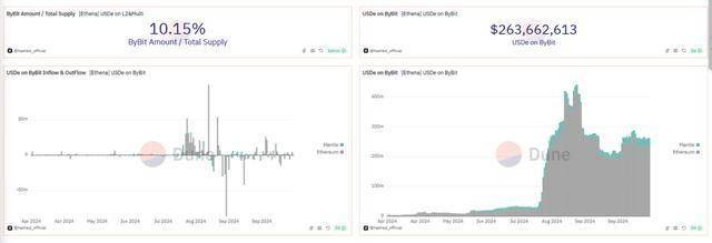 此外,Bybit作为Ethena的投资方和重要合作平台,不但支持USDE作为保证金进行衍生品交易,还为存放在Bybit的USDE提供一度高达20%的收益率(9月降低至最高10%)。因此Bybit也是USDE最大的托管方之一,目前拥有2.63亿的USDE(高峰时期超过4亿)。