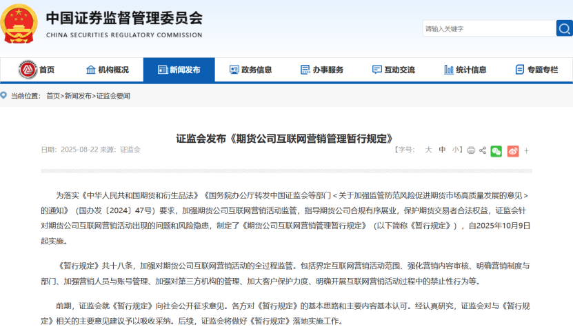 8月22日,中国证监会公告称,针对期货公司互联网营销活动出现的问题和风险隐患,证监会制定《期货公司互联网营销管理暂行规定》(以下简称《暂行规定》),自2025年10月9日起实施。