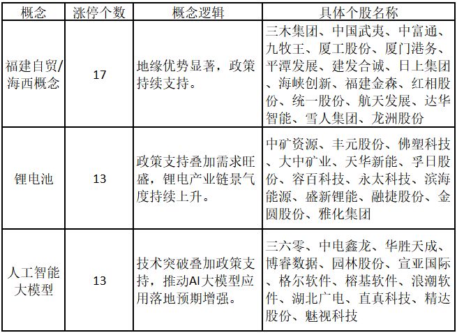 从概念特征来看,今日涨停板个股中,福建自贸/海西概念、锂电池、人工智能大模型概念的个股最多。