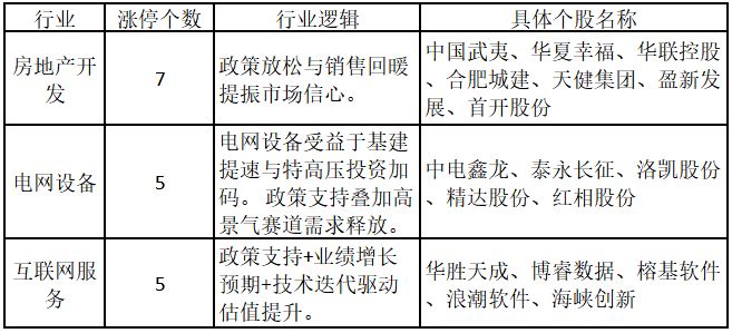 从行业特征来看,今日涨停板个股中,房地产开发、电网设备、互联网服务行业的个股最多。