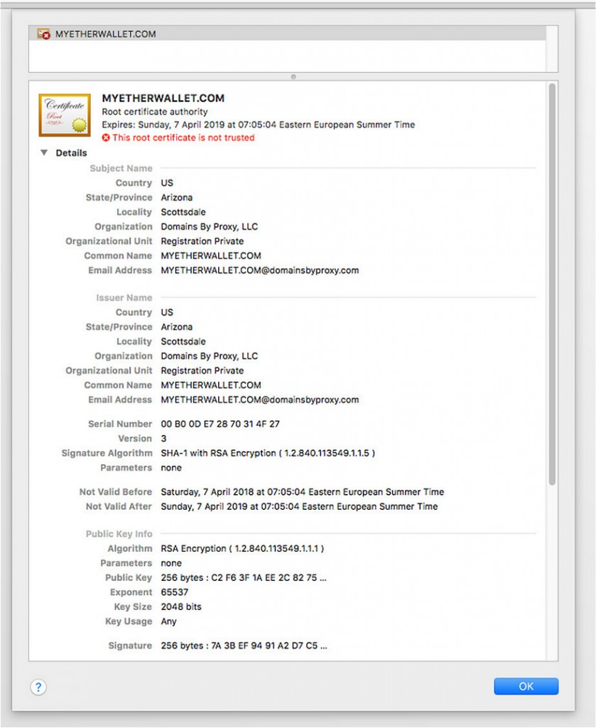 2018年4月23日午夜时分,MyEtherWallet的用户开始注意到一些奇怪的事情。因为需要将钱包和服务进行连接,用户就会看到一个未签名的SSL证书,这是一个在网站的验证上显示不完整的链接。这是不寻常的,但面对这一点网民们经常就不假思索直接点击链接了。