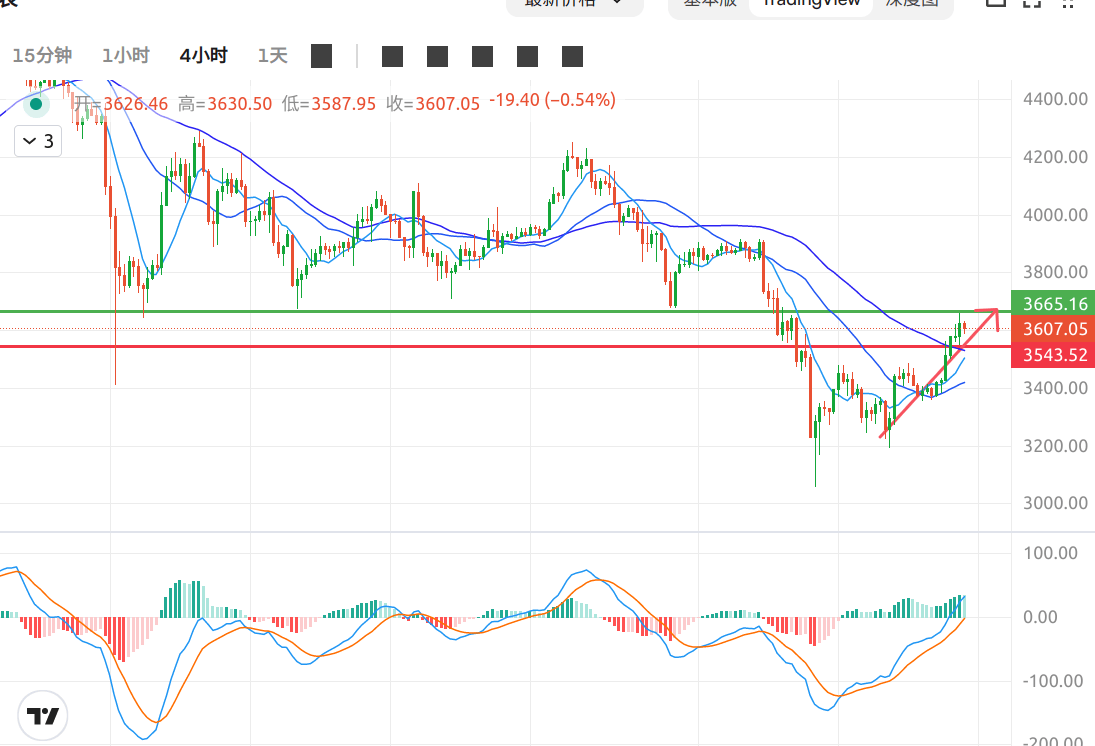 以太坊昨日跟随比特币走强,今日凌晨突破3600美元,日内涨幅超过6%。小时图呈现单边上涨趋势,多头动能集中释放,回踩3540至3560美元区域后快速拉升,短期目标看向3670至3700美元。RSI指标显示看涨背离,卖压逐步减弱。此外,4小时图显示EMA均线呈多头排列,且价格已站稳布林带上轨,短期上行动能充足;若突破3670美元,可能进一步测试3750美元附近阻力。