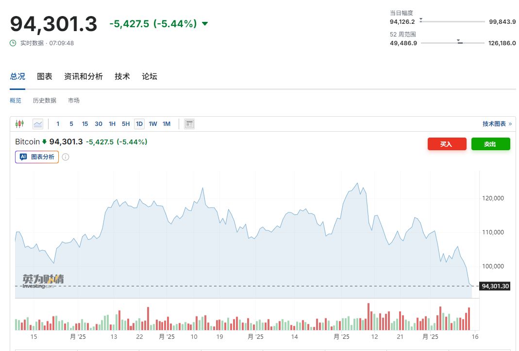 截至11月15日发稿,比特币跌破95000美元关口,报94301.3美元,跌幅5.44%。