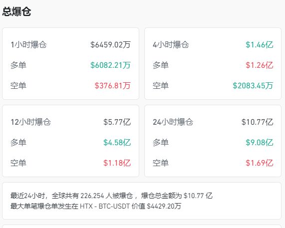 新一轮的急速杀跌,又导致不少人爆仓。CoinGlass数据显示,24小时加密货币市场超22万人被爆仓,爆仓总金额为10.77亿美元(约合人民币76亿元)。