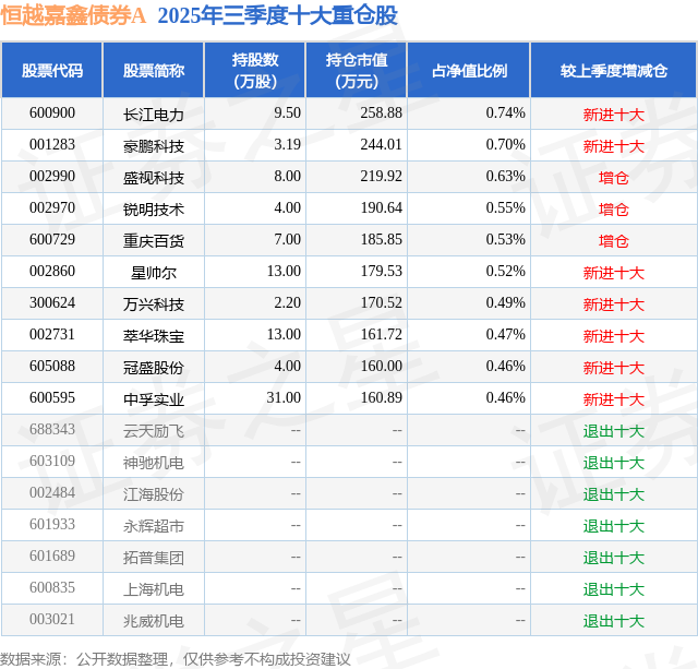 根据2025基金Q3季报公募基金重仓股数据,重仓该股的公募基金共1家,其中持有数量最多的公募基金为恒越基金的恒越嘉鑫债券A。恒越嘉鑫债券A目前规模为0.77亿元,最新净值1.2079(11月20日),较上一交易日下跌0.21%,近一年上涨9.93%。该公募基金现任基金经理为吴胤希 白钰。吴胤希在任的基金产品包括:恒越安裕纯债债券,管理时间为2024年3月13日至今,期间收益率为5.28%;恒越均衡优选混合发起式A,管理时间为2024年5月16日至今,期间收益率为43.93%;恒越季季乐3个月滚动持有债券A,管理时间为2024年10月22日至今,期间收益率为3.34%。